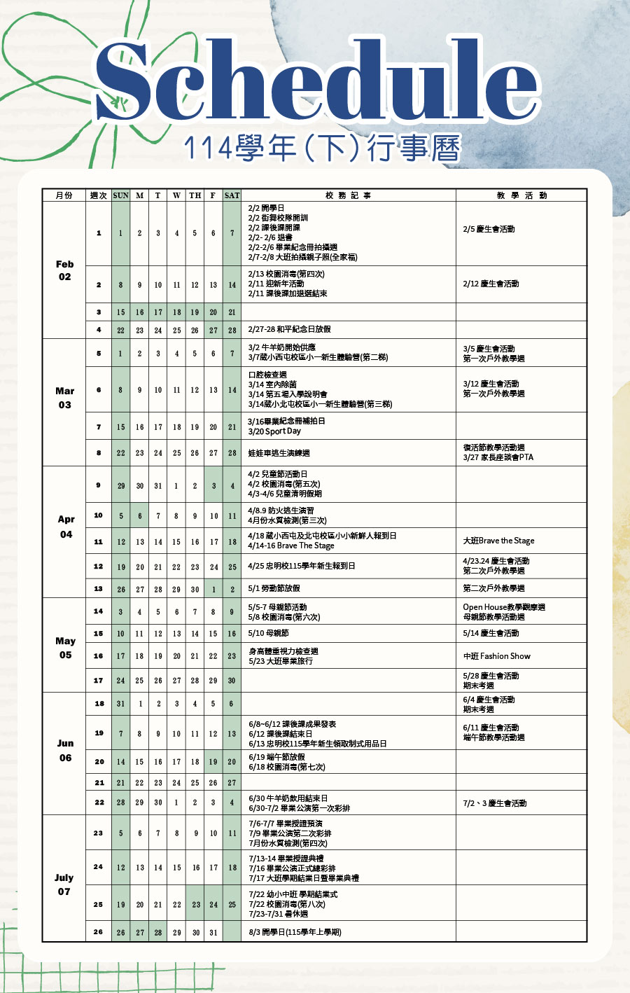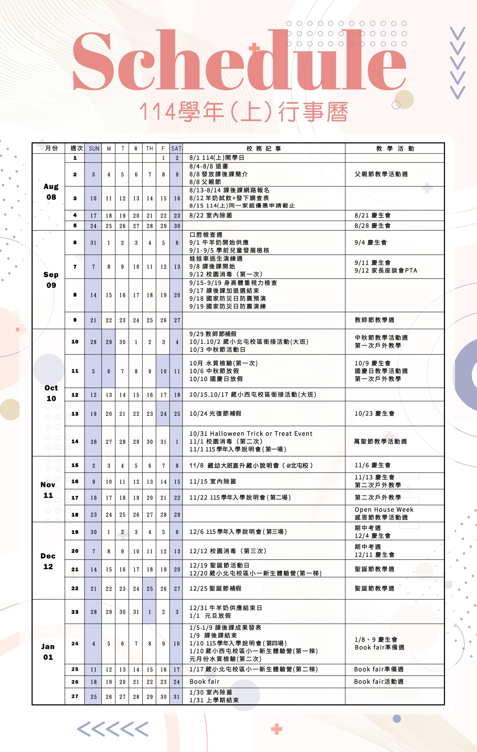 學期行事曆 Academic Calendar